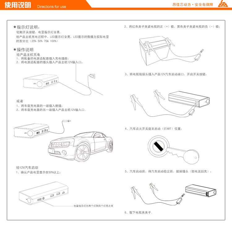 給12V汽車啟動(dòng)時(shí),先確認(rèn)昂佳A3汽車應(yīng)急啟動(dòng)電源電量指示燈在2顆以上(即50%以上),將紅色夾子夾緊電瓶的正(+)極,黑色夾子夾緊電瓶的負(fù)(-)極;然后將電瓶線接頭插入昂佳A3汽車應(yīng)急啟動(dòng)電源,汽車點(diǎn)火開關(guān)旋至啟動(dòng)(START)位置。汽車啟動(dòng)后,立即拔掉插頭,再取下電瓶夾夾子。