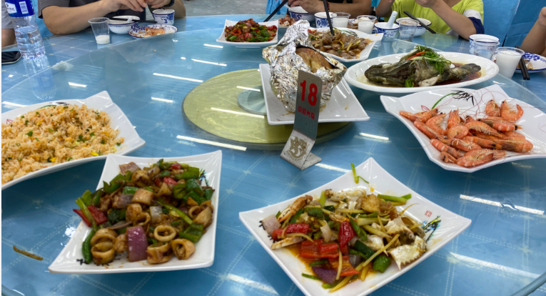 經過兩個多小時的風雨兼程,終于達到了目的地,此時可口的飯菜早已經準備好了,當地窯雞、海膽炒飯、清蒸鱸魚等等海鮮、美味陸續上桌,直接開吃