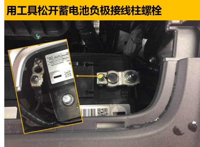 注意:將松開(kāi)的負(fù)極連接線固定位置,避免因?yàn)槠渌淮_定因素導(dǎo)致連接線觸碰到接線柱使蓄電池繼續(xù)耗電;工具使用M10套筒或者扳手。