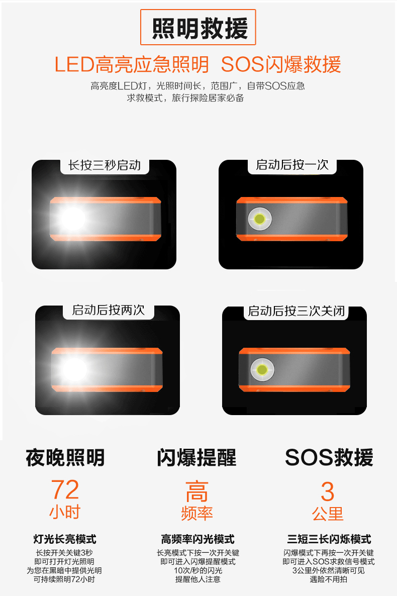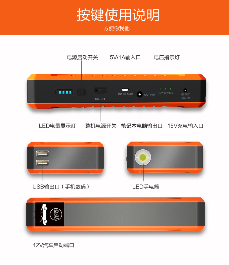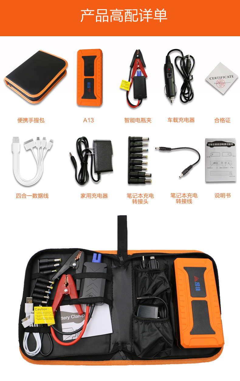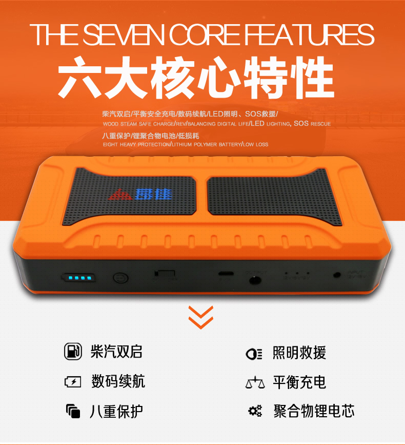 • 主要的功能:汽車應急啟動、LED燈(照明、爆閃、SOS)另可對車載電器、手機、平板電腦、MP4、數碼相機、PDA、掌上游戲機、學習機等產品充電